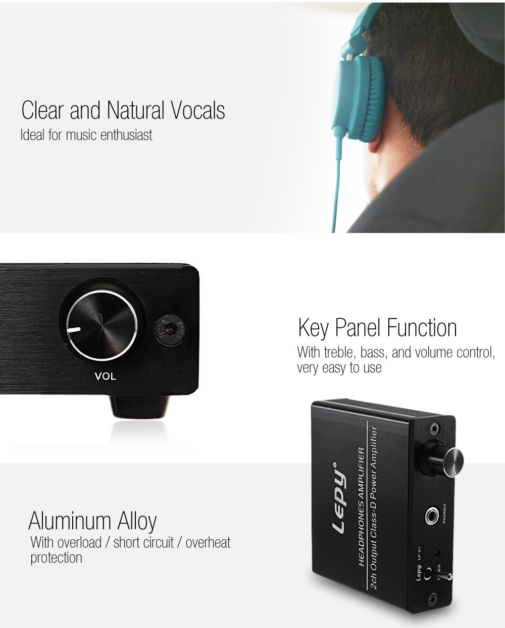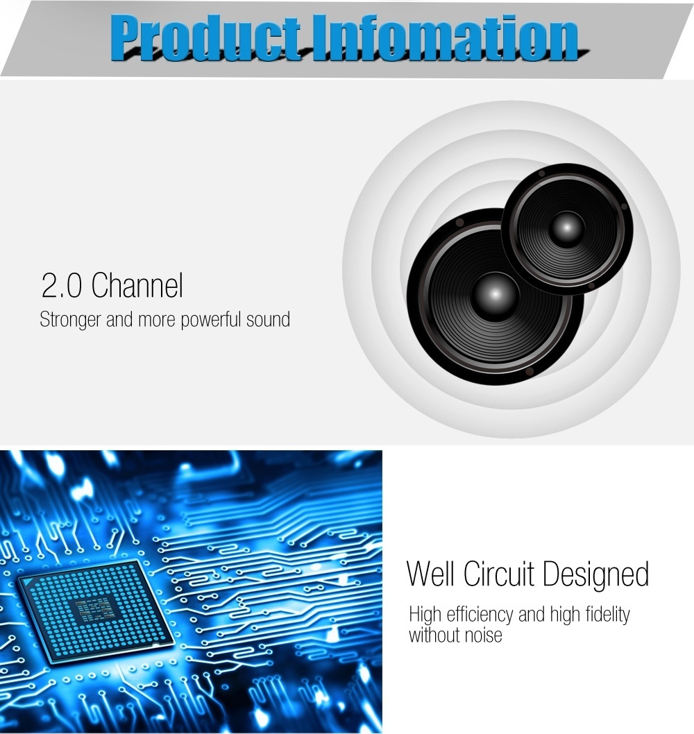 Main Features:- Small distortion supplies clearer 2.0 channel, stronger and more powerful sound - With treble, bass, and volume control, very easy to use - Diverse play mode: can play music directly from AUX input and phones - Made of lightweight aluminum alloy, it is portable with overload, short circuit, overheat protections - Well circuit designed, supplies high efficiency and high fidelity without noise - Compact appearance and efficient output give you a perfect listening experience - Clear and natural vocals,>